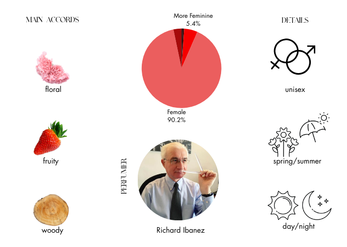 This fragrance was created by the house of Lalique with perfumer Richard Ibanez and released in 2015. A sweet musky floral blend with a warm and inviting base. Juicy fruit notes allow the floral notes to become sweet and refreshing.