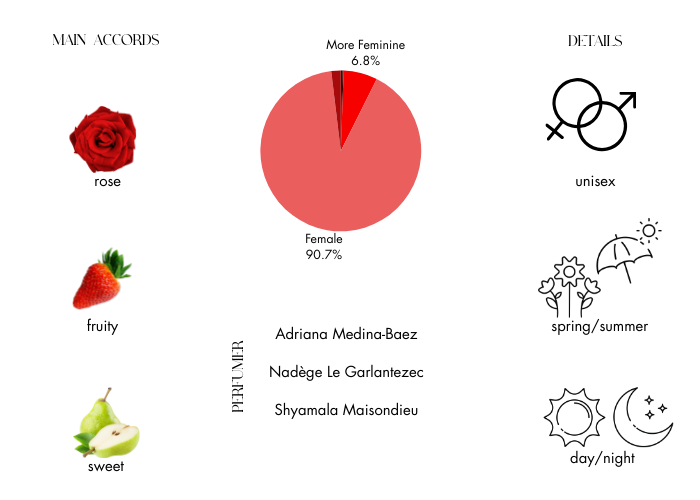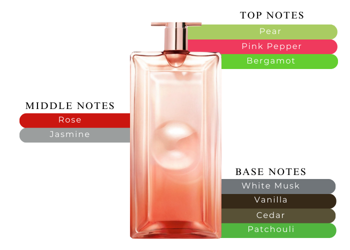 Top Notes: Bergamot (Citrus),Juicy Pear, Pink Peppercorn Middle Notes: Rose and Jasmine Bottom Notes: White Musk, Vanilla, Patchouli, Cedar wood