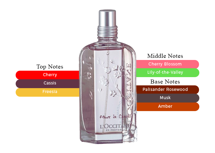Top notes: Cherry, Freesia, Cherry. Heart notes: Lily of the valley, Cherry Blossom. Base notes: Brazilian Rosewood, Amber, Musk.