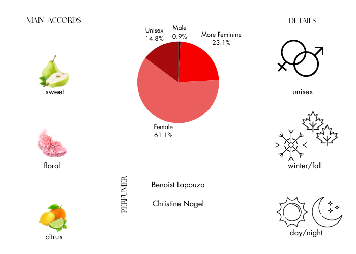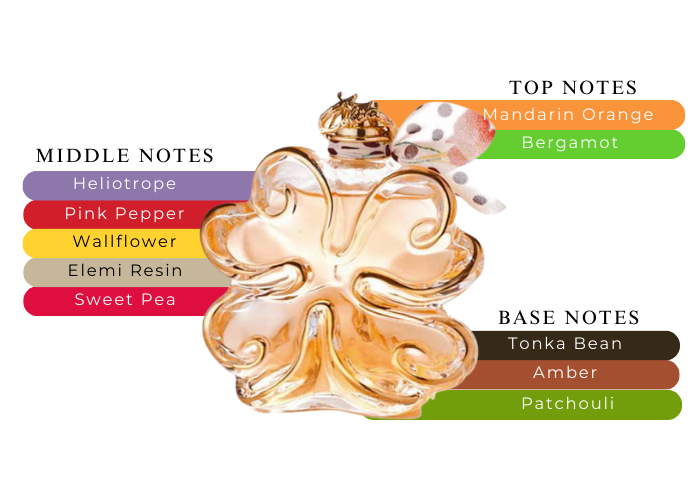 Perfume notes are pink peppercorn, bergamot, mandarin, wallflower, sweet pea, heliotrope, elemi, amber, patchouli and tonka bean.