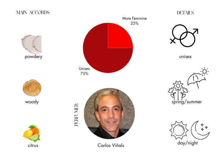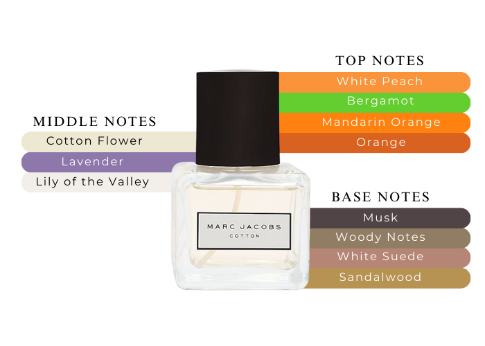 Fragrance notes are Peach, Mandarin, Bergamot, Aquatic Accord, Lavender, Jasmine, Cotton Accord, Lily of the Valley, White Suede, & Blonde Woods, Musk.Made in USA.