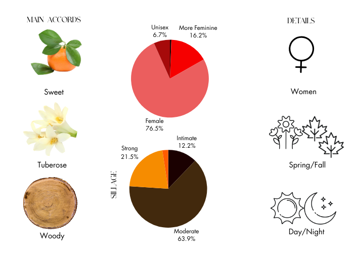 - Middle notes are Tuberose, Jasmine Sambac, Tobacco, Orange Blossom and Ylang-Ylang