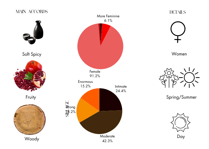 Fragrances notes are red currant jam, pink rose , peach, intense and woody notes , including accords of sandalwood, patchouli and rosewood and musk and raspberry.