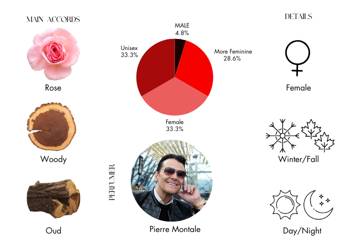 Product Description Montale is a Parisian fragrance house that has mastered the blend of Eastern ingredients with Western techniques. Pierre Montale is best known as the first French perfumer to base a line on Aouds.Aoud rose petals is an unusual and complex composition of flowers and woods, in which voluptuous red rose foregoes deep and noble notes of precious woods (oud, teak, cedar and guaiac) with spicy nuances (saffron).
