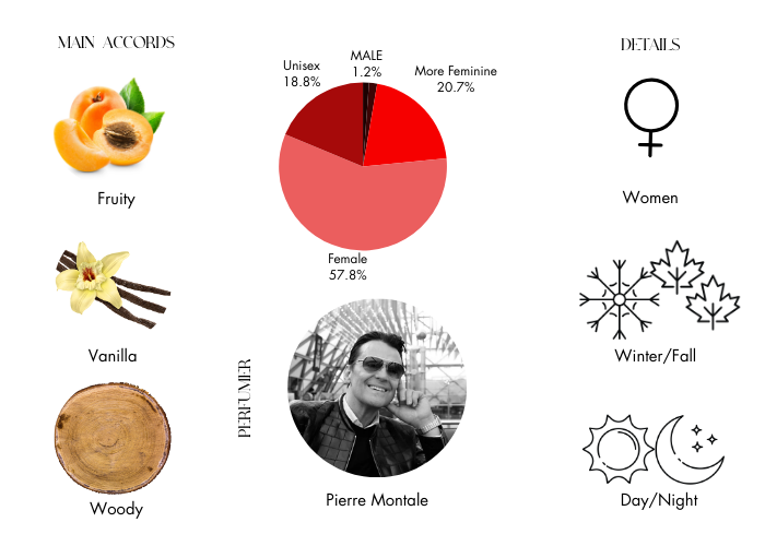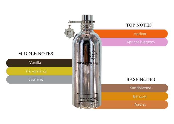 Montale Vanilla Extasy by Montale Perfume. Montale Vanilla Extasy is a warm, creamy vanilla perfume for women launched in 2008. It includes fruity, floral notes with a strong vanilla scent that informs the rest of the scent. A light touch of apricot and apricot blossom bring sweet, light opening notes. The middle notes are more floral, featuring heady jasmine, tropical ylang ylang and vanilla. The base includes heavier, warm notes to contrast with the light and sweet top notes and heart. Deep mahogany introduces a woody quality, which meshes with benzoin, resins and smoky sandalwood. The wood-heavy base adds the Eastern element this brand is known for. A light application lasts all day, because of its heavy sillage.