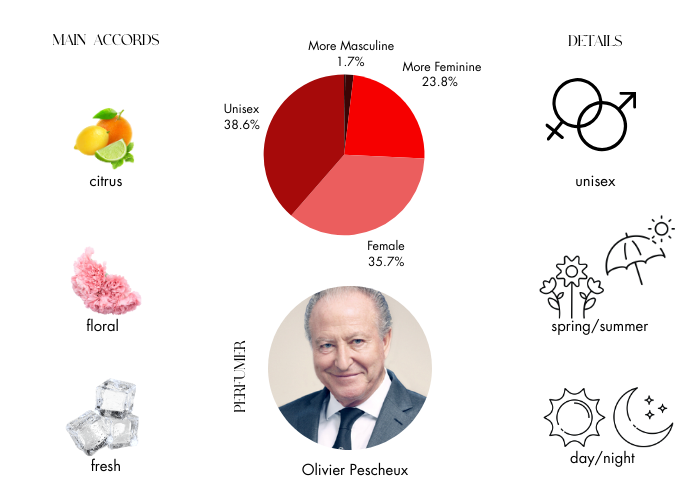 A surprising and ironic product, Fresh Couture fragrance plays with fresh and joyful accents. Its sparkling top notes of mandarin and bergamot are enriched with exotic ylang-ylang. Juicy raspberry provides contrast to the floral heart of velvety white peony and osmanthus. The base underscores refined and modern character of the perfume with accords of clear woods, white patchouli and ambrox.