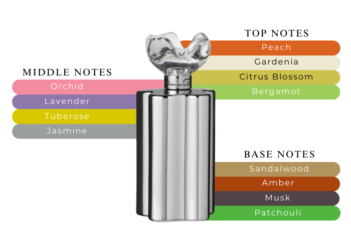 Oscar White Gold Perfume by Oscar De La Renta, The dynamic Oscar White Gold perfume was released in 2017 and is sold in a modern, chrome-tinted flacon with a flower-shaped cap. The top notes of this unisex scent are peach, gardenia, citrus blossom and citrus bergamia. The heart of this scent comes through with a floral bouquet of tuberose, lavender, jasmine and orchid. The base of this fragrance has deep notes of sandalwood, lavender, musk, amber and patchouli. This scent is a complex marriage of some of the most delicious fragrances of nature and it works for day or night-time use.