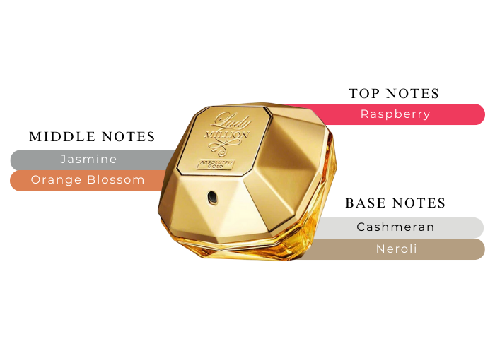 Top note of Raspberry with middle notes of Orange Blossoms and jasmine blended with base notes of Neroli and Cashmeran.