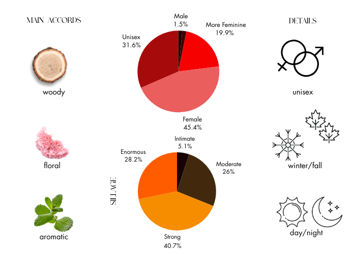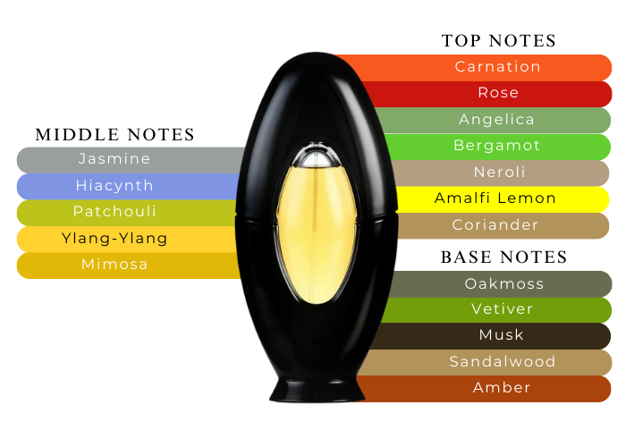 This classically passionate fragrance is a combination of Bergamot, Neroli, Jasmine, Rose, Ylang-Ylang, Coriander, Patchouli, Vetiver, and Amber.