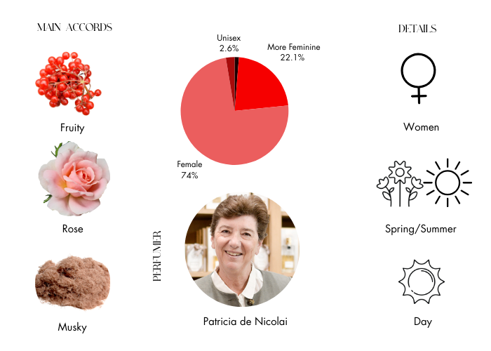 - Top Notes : Essence of Ambrette seeds, Raspberry, Blackcurrant, Essence of Bergamot
