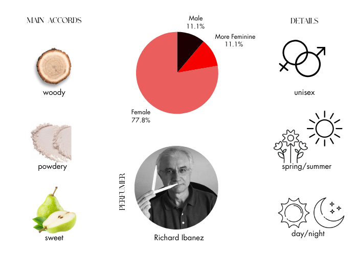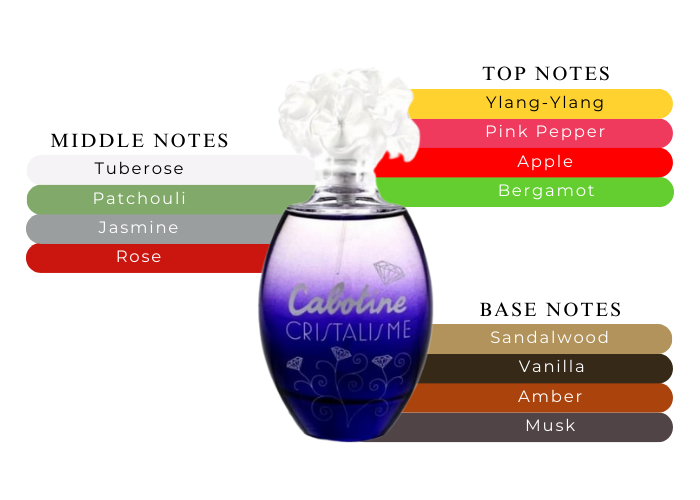 Top notes: bergamot, green apple, ylang-ylang and pink pepper. Heart: patchouli, rose, Sambac jasmine and tuberose. Base: amber, musk, sandalwood and vanilla.
