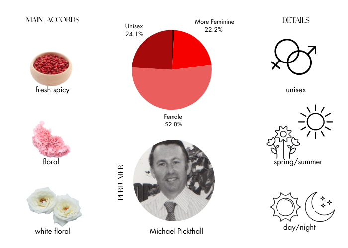 Fragrance notes areCitrus, Hyacinth, Lily of the Valley, Cyclamen, Jasmine, Rose, Galbanum, Clove,& Cinnamon ,Made in England.