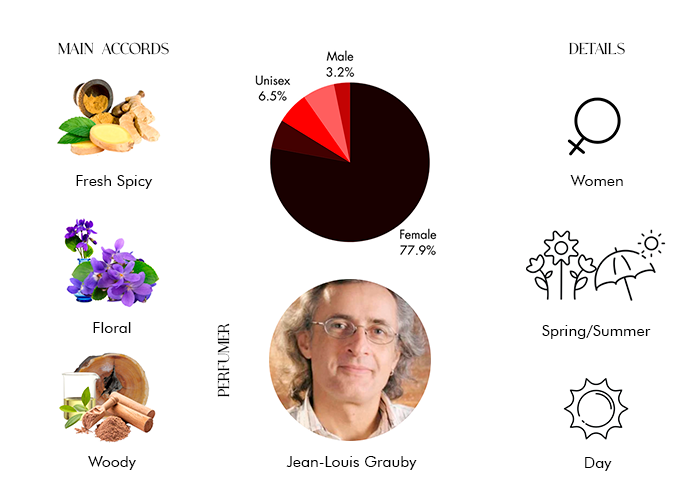 - Chamomile, Freesia, Ginger, Lotus, Oak Wood, Patchouli, Pot Marigold, Rose and Violet