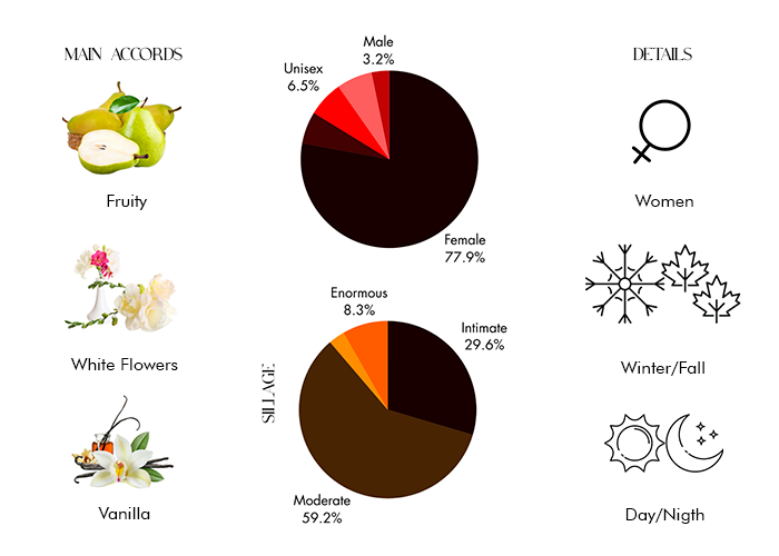 Top notes are Pear, Bergamot and Neroli; middle notes are Heliotrope, Freesia and Rose; base notes are Vanilla, Musk and White Woods.