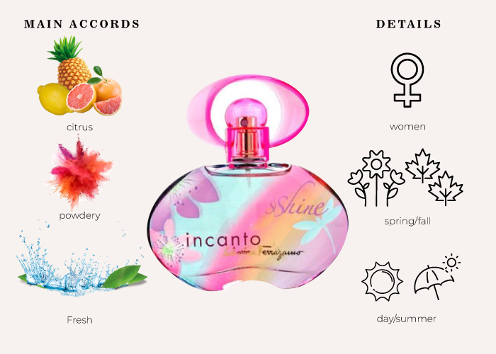 Incanto Shine is a symphony of floral and fruity delights, masterfully composed to awaken your senses and leave a lasting impression. The opens with a burst of pineapple, mingling with the sweetness of passion fruit. As the fragrance evolves, a delicate bouquet of freesia & peach takes center stage. These floral notes usher in a romantic and feminine aura, embodying grace and sophistication.