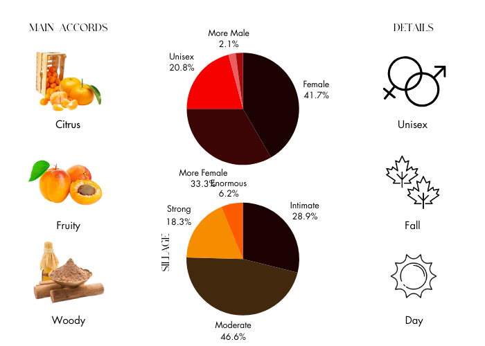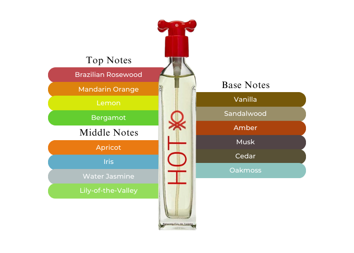 Top notes are mandarin orange, bergamot, brazilian rosewood and lemon; middle notes are apricot, iris, water jasmine and lily-of-the-valley; base notes are sandalwood, amber, musk, vanilla, oakmoss and cedar.