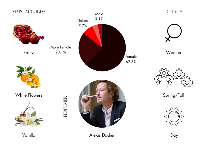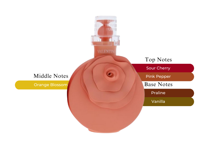 Fragrance notes are pink pepper, sour cherry,rose, coffee, patchouli essence, and pink praline accord.