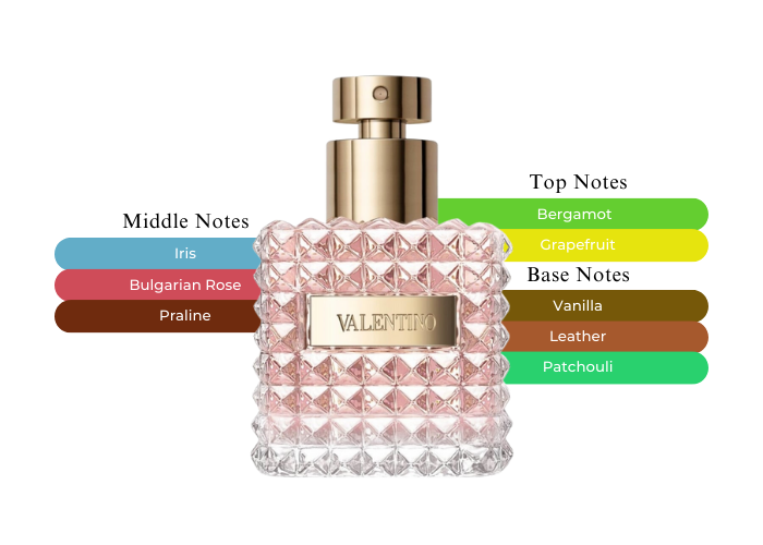 - Middle Notes: Iris, Bulgarian Rose and Praline