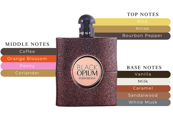 The perfume combines the energy of coffee with sparkling orange blossom, illuminated by white musk. There are notes of silky smooth rice, Bourbon pepper, orange blossom absolute, Black Opium coffee, vanilla absolute, sandalwood and white musk.