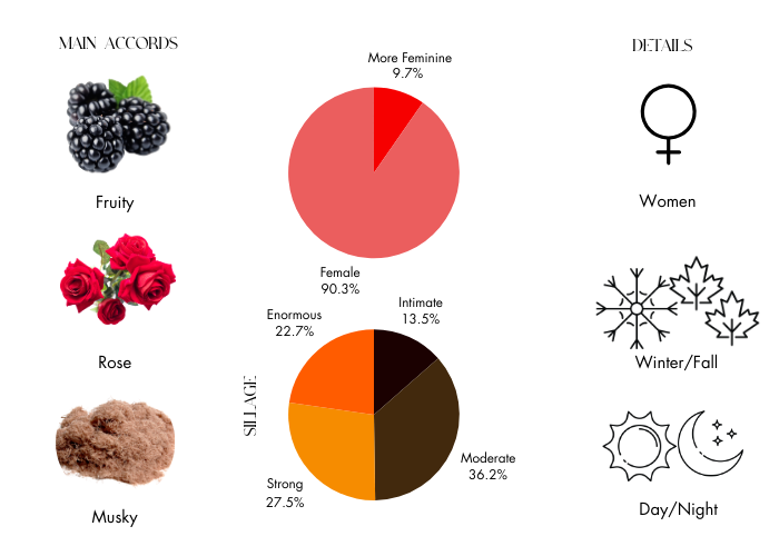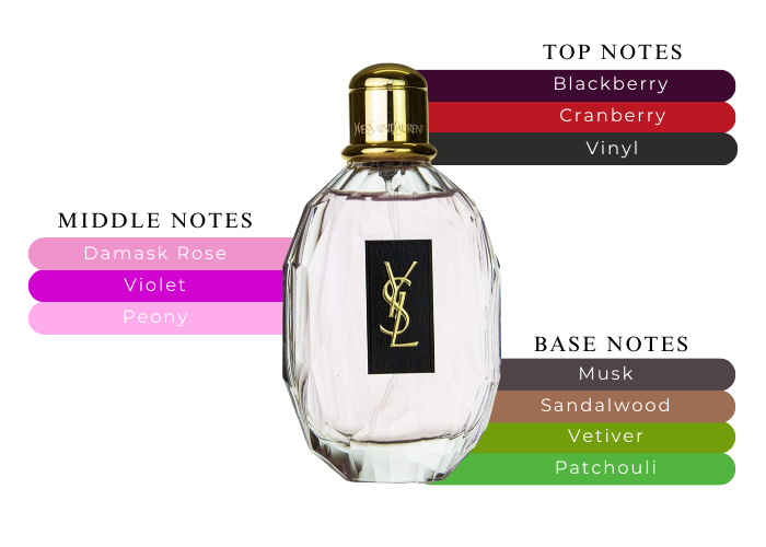 Fragrance notes are blackberry, violet, patchouli, sandalwood, vetiver, cranberry, peony, musk, & damask rose.