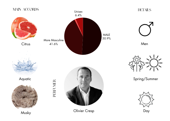- Middle Notes: Aquatic Notes, Cardamom and Lavender