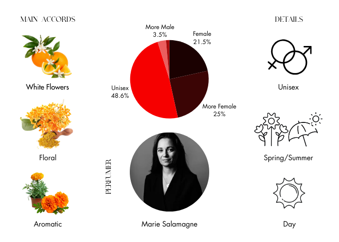 - Top notes are Calone, Orange Blossom and Bergamot.
