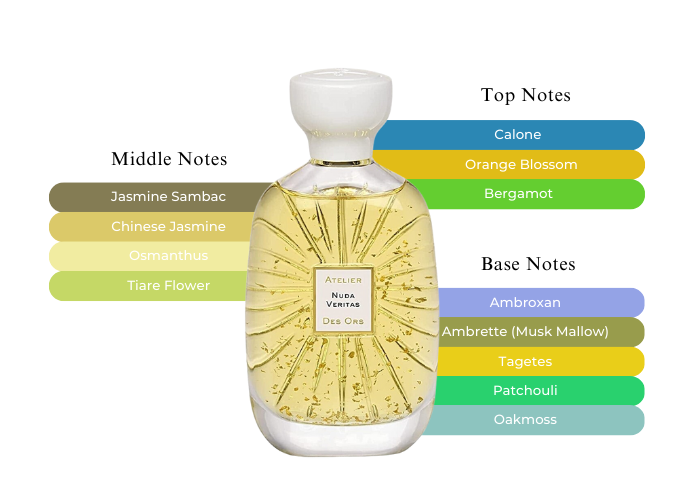 Atelier des Ors Nuda Veritas contains top notes of bergamot, orange blossom and calone, followed by heart notes of jasmine, osmanthus and tiare flower. It has patchouli and oakmoss as base notes.