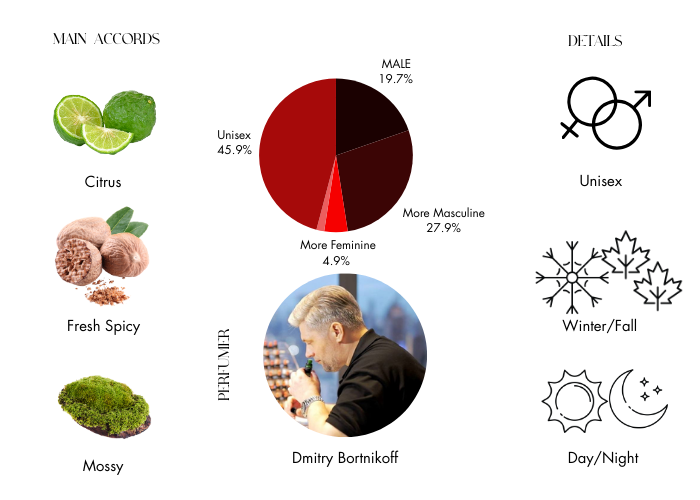 Ingredients Top Notes: Bergamot, Orange Heart Notes: Peach, Nutmeg Base Notes: Oakmoss, Benzoin, Siberian Deer Musk, Cedar, Birch Tar, Tonka Bean Olfactory description Chypre du Nord is a classically inspired fragrance embracing the finest traditions of European perfumery and reviving the majesty of a long-established style of fragrance. The chypre scent originated in France in the early 20th Century and in Chypre du Nord perfumer Dmitry Bortnikoff has brought his own unique and inimitable touch to the style. Opening with bright bergamot and succulent orange notes, the scent transitions to reveal the juicy sweetness of peach and the spiciness of nutmeg in its heart. In the base of the composition the truly unique and precious elements of the perfume make themselves apparent. Real oakmoss has always been one of the quintessential ingredients of the chypre scent and here it makes its unmistakable presence felt. Resinous and sweet benzoin mingles with tonka bean and birch tar to produce a smooth and sensuous aura. Finally, rare and scarce Siberian deer musk imparts its magical quality to round out this enchanting creation. Whilst the chypre is a traditional and very common style of fragrance, the specially cultivated ingredients used in Bortnikoff scents mean that Chypre du Nord has a depth of complexity and sophistication that is seldom found elsewhere. The rich extrait de parfum concentration ensures an enduring and evolving experience for the wearer and allows the beauty of the perfume to be fully appreciated. This unisex creation can be enjoyed in all season and on all occasions. Allow yourself to be surrounded in a veil of beauty and refinement with this unforgettable perfume.