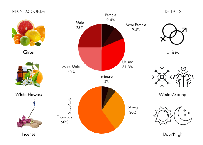 - Top notes are Aldehydes, Citruses and Fruity Notes.