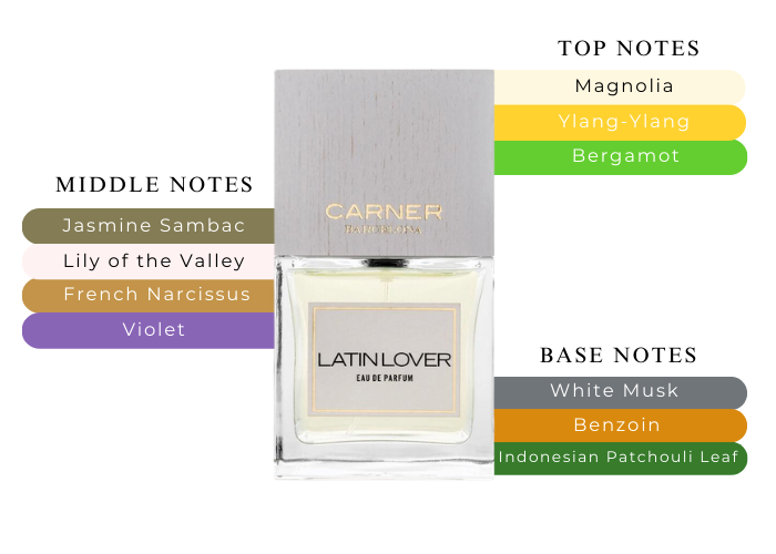 Latin Lover Perfume by Carner Barcelona, A more recent addition to the perfume collection by Carner Barcelona, Latin Lover was launched in 2017 and was created to be worn by both men and women. Designed in collaboration with perfumer Jordy Fernandez, this captivating scent grabs your attention with the more herbaceous top notes of magnolia, ylang-ylang and bergamot. The middle notes of sambac, violet, French narcissus, jasmine and Lily of the Valley provide a smooth floral transition into the stronger, more passionate base notes of benzoin, whit musk and Indonesian patchouli leaf.