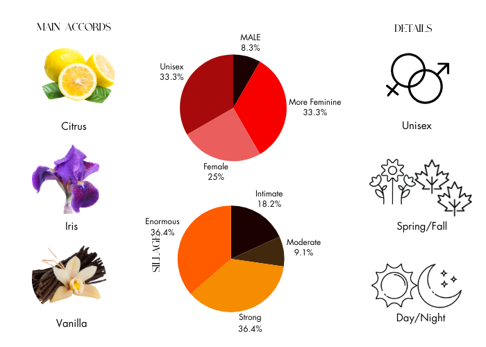 - Base Notes: Vanilla, Tonka Bean, Musk, Cedarwood and Patchouli